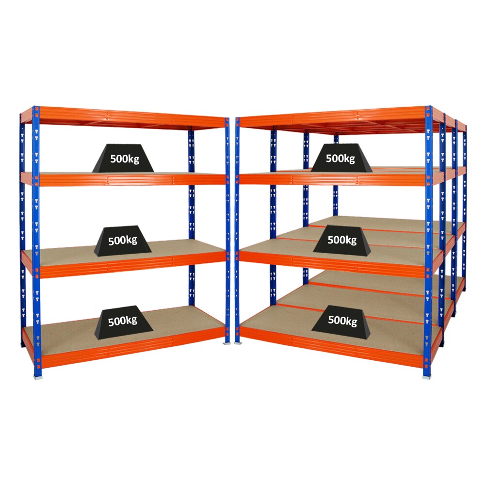 PROREGAL Mega Deal 4x Profi Schwerlastregal Rhino | HxBxT 180x160x60cm | 4 Spanplatten-Ebenen 8mm | Fachlast 500kg | Blau-Orange