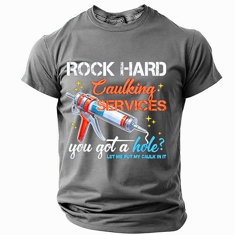 Men's Graphic T-Shirt, Funny Pun Short Sleeve Tee with 'Rock Hard Caulking Services, Got A Hole? Let Me Put My Caulk In It' Slogan