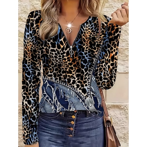 Per donna Maglietta Grafico Leopardo Moda Casual Manica Lunga Girocollo Scollo a V Top Regolari Quotidiano Cerniera Stampato Blu Primavera Autunno Inverno