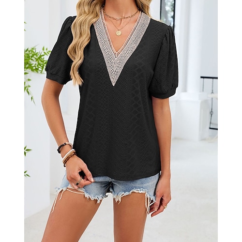 Per donna Maglietta Top estivi Tinta unica Elegante Moda Classico Manica Corta Scollo a V Top Regolari Quotidiano Uscire Weekend Patchwork Traforato Blu Nero Bianco Rosa Viola Estate Primavera