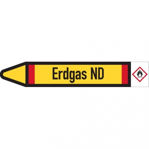 Dreifke® Rohrleitungskennzeichen-Etikett Erdgas ND, links, DIN, gelb/schwarz/rot, für Ø 40-60mm, 218x37mm, 5/Bogen