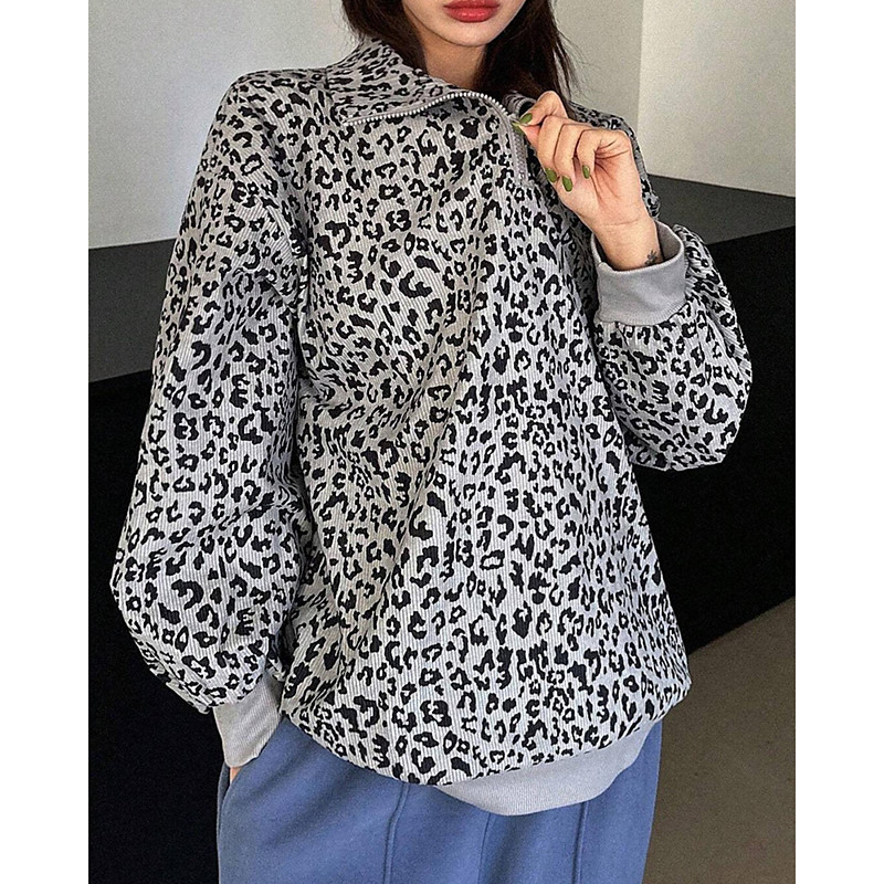 Women's Pullover Sweatshirts Zip Up Sweatshirts Leopard Sports Fashion Casual Long Sleeve High Neck Regular Tops Street Dailywear Half Zipper Quarter Zipper Print Black Brown Khaki Dark Gray Coffee