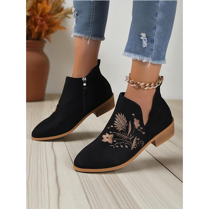 Women's Red Ankle Boots – Faux Suede Embroidered Zipper Low Heel Booties for Christmas, Parties and Casual Style