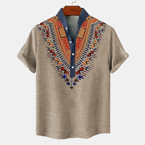 Per uomo camicia di lino Camicia Henley camicie retrò Camicia d'epoca Camicia etnica Etnico Da mare Giornaliero Blu Verde Cachi Manica corta Alla coreana Estate Primavera Abbigliamento Stampa