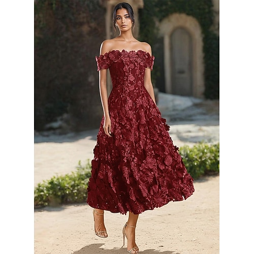 Linea ad A Lunghezza Tè Abiti da Cocktail Abiti da festa Elegante Senza Maniche Senza Spalle Festa in giardino Matrimonio Pizzo con Applicazioni