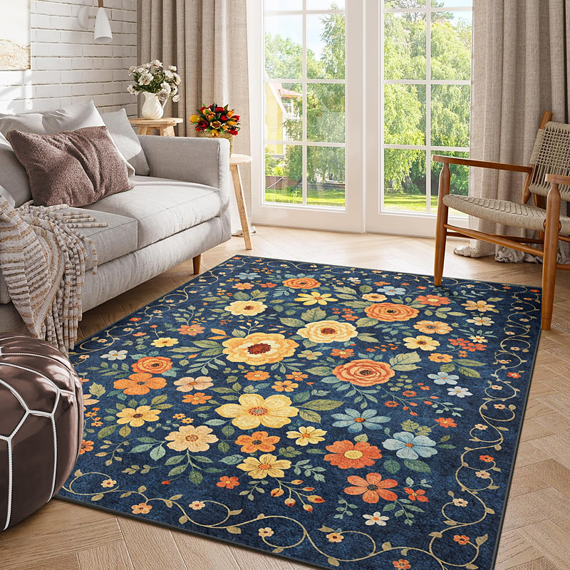 Vibrant Floral Medallion Area Rug, Navy Blue with Multicolor Flowers, Ideal for Bohemian Living Room Bedroom Decor