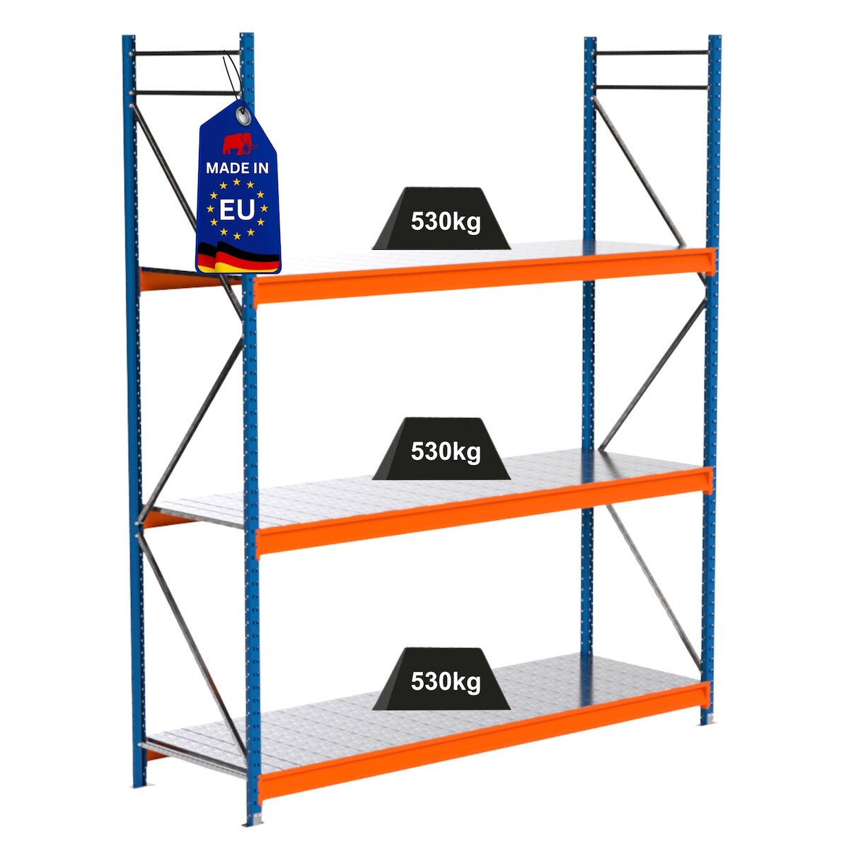 PROREGAL Industrie Schwerlastregal MAXIMUS PRO, Grundregal, HxBxT 300x250x80cm, 3 Ebenen, Stahlplatten-Fachboden, Fachlast 530 kg, Blau/Orange