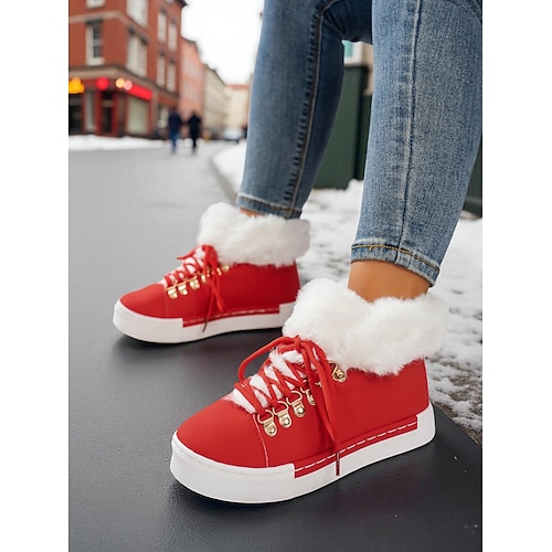 sneakers da donna in pelliccia sintetica rossa - calde scarpe invernali con lacci e fodera in peluche, calzature casual natalizie per look outdoor e street style
