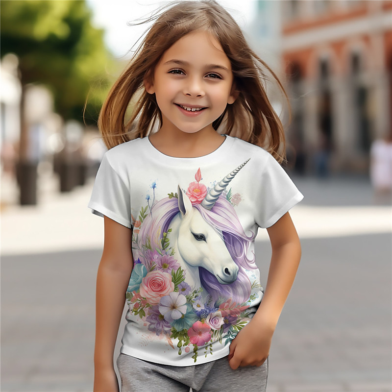 Girls' 3D Unicorn Tee Shirts Pink Short Sleeve 3D Print Summer Active Fashion Cute Polyester Kids 3-12 Years Crew Neck Outdoor Casual Daily Regular Fit