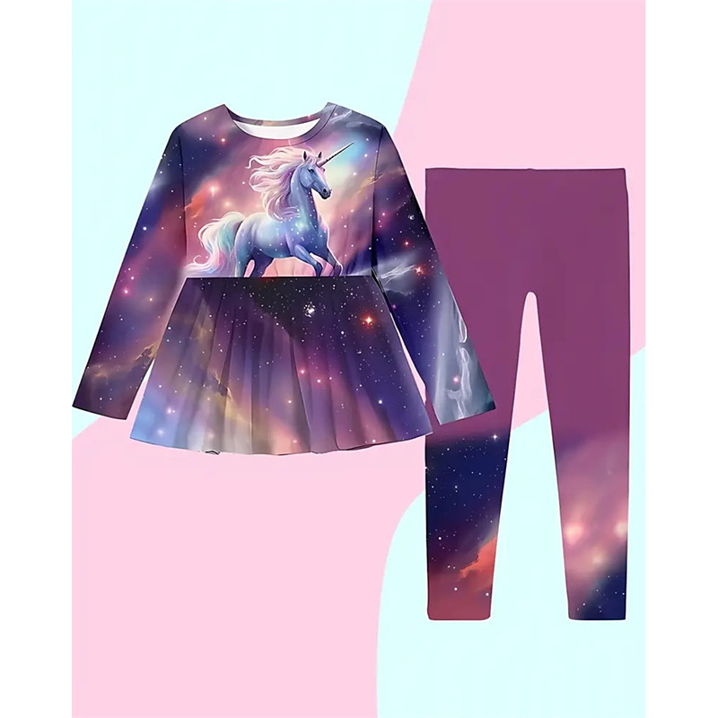 Girls' 3D Unicorn Set T-shirt Legging Long Sleeve Summer Spring Fashion Daily Basic Kids 4-12 Years Crew Neck Outdoor Vacation Tailored Fit