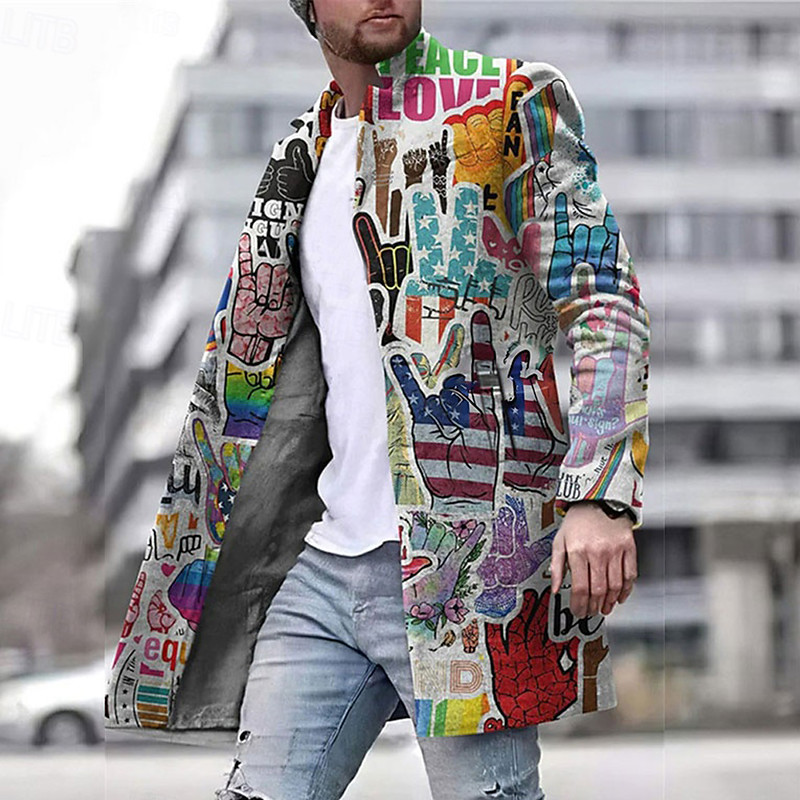 Men's Graffiti National Flag Winter Coat Overcoat Coat Warm Comfortable Breathable Fashion Streetwear Business Work Wear to work Going out Pocket Print Fall Winter Turndown Long Sleeve Gray