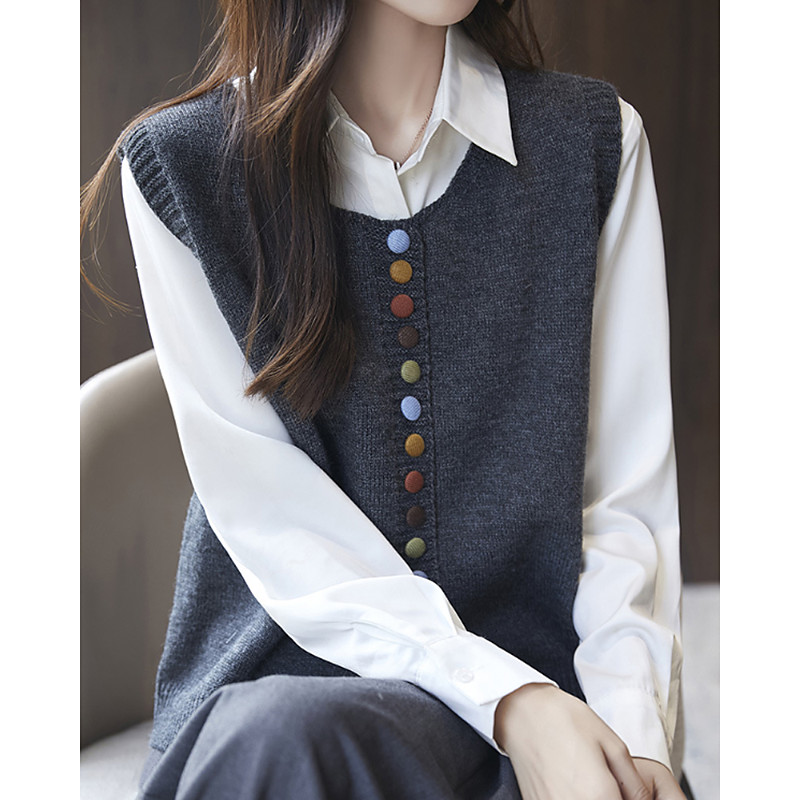 Women's Sweater Sweater Vest Streetwear Casual Solid Color Crew Neck Buttons Knitted Sleeveless Regular Tops Knit Daily Holiday Going out Black Red Fall Winter
