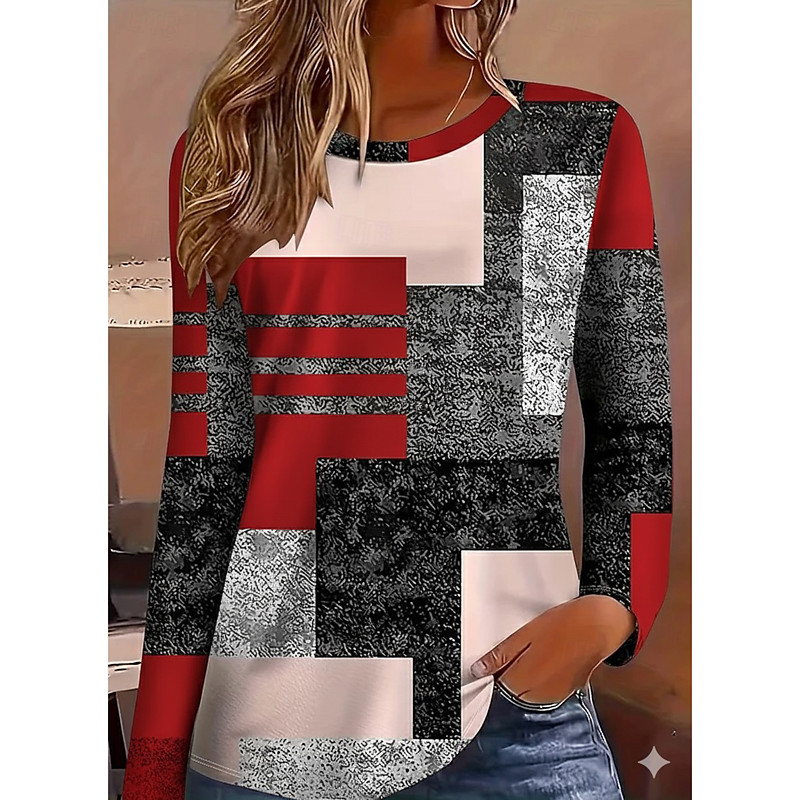 Women's T Shirt Graphic Geometric Fashion Casual Long Sleeve Crew Neck Regular Tops Daily Print Blue Pink Red Light Brown Summer Spring Fall Winter