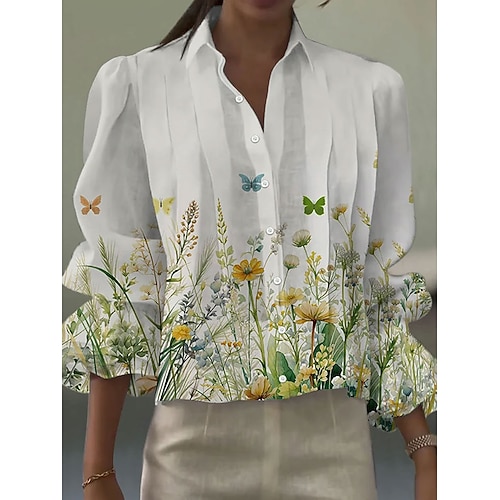 Camicia da donna in lino simile traspirante leggera grafica floreale elegante bohemia vintage a maniche lunghe colletto top regolari lavoro quotidiano vacanza arricciatura blu bianco rosa arancione