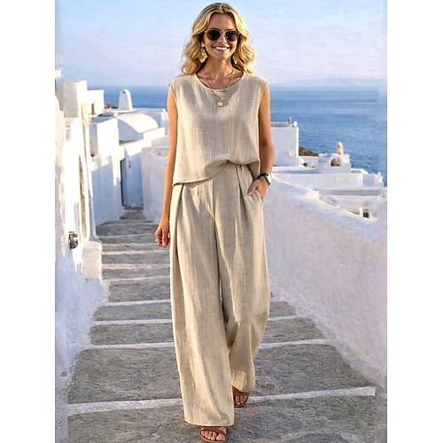 Per donna Set di Pantaloni Bolero Top Finto cotone e lino Senza Maniche Girocollo Tinta unica Moda Streetwear Casuale Quotidiano All'aperto Cachi Estate Vestibilità comoda