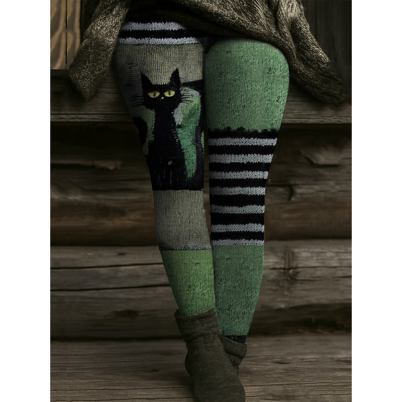 Women's Leggings Vacation Vintage Ethnic Style Full Length High Waist Graphic Animal Cat Drawstring Patchwork 3D Print Quick Dry Breathability Soft Stretchy Formal Outdoor Vacation Gray Green
