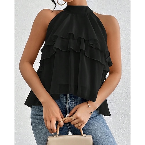 Per donna Canotta Maglietta Tinta unica Elegante Moda Senza Maniche Collo Alto Top Regolari Quotidiano Uscire Weekend Volant Nero Blu marino Azzurro cielo Viola Verde Estate Primavera