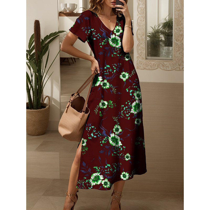 Women's Maxi Dress Knit Dress Casual Dress Sundress A Line Dress Elegant Vacation Casual Beach Regular Fit Floral Graphic Short Sleeve V Neck Blue Dark Brown Red Purple Summer Spring