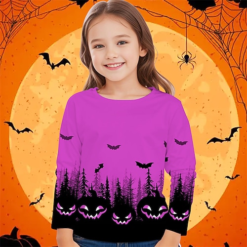 Halloween Mädchen 3D Kürbis Fledermaus T-Shirt Langarm Frühling Herbst Mode Basic Kinder 4-12 Jahre Rundhalsausschnitt Outdoor Lässig Täglich Normale Passform
