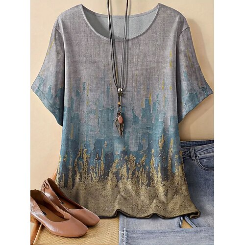 Per donna Maglietta Top estivi Finto cotone e lino Grafico Geometrico Vintage Moda Casual Manica Corta Girocollo Top Regolari Quotidiano Weekend Patchwork Stampato Grigio chiaro Estate Primavera