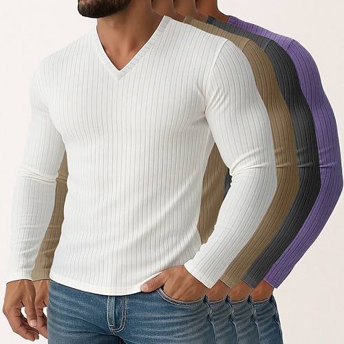 Herren T Shirt Geripptes Strick-T-Shirt T-Shirt Langarmshirt Langarm V Ausschnitt Frühling Herbst Winter Einfach Grubenstreifen Mode Designer Basic 4 Teile Mehrfachpackung Urlaub Straße Lässig 8# 9