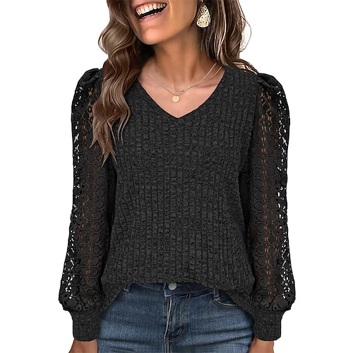 Per donna Maglione Elegante Tinta unica A Coste Scollo a V Pizzo Manica Lunga Top Regolari Maglia Quotidiano Nero Bianco Primavera Autunno