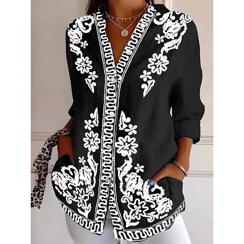 Women's Shirt Button Down Tunic Shirt Collar Long Sleeve Floral Graphic Geometric Casual Regular Tops Work Daily Holiday s Print Denim Blue Black Orange Light Blue Spring