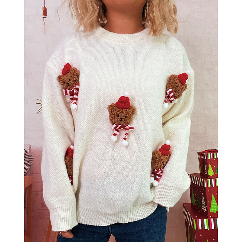Women's Sweater Pullover Pom Poms Ugly Christmas Gifts Streetwear Animal Crew Neck Knitted Long Sleeve Regular Tops Knit Christmas Holiday Going out White Red Fall Winter