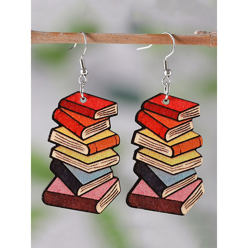 Women's Colorful Book Stack Earrings - Lightweight Wooden Pendant Jewelry for Teachers, Students, Book Lovers - Fun Back to School or Graduation Gift