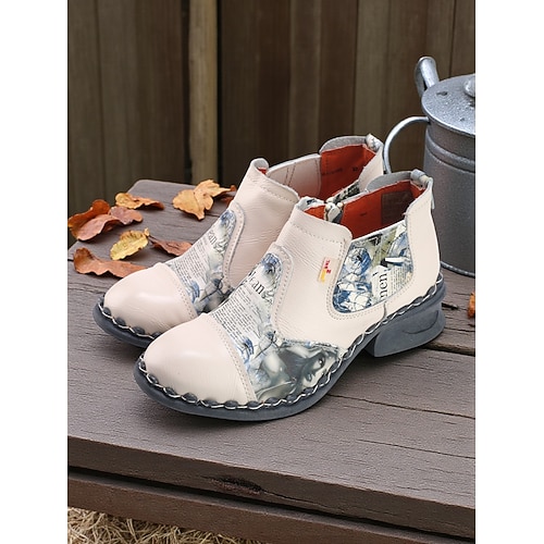 stivaletti da donna in vera pelle fatti a mano con patchwork di stampe artistiche, comodi stivaletti chelsea casual in stile vintage per Natale, abiti invernali riunioni di festa