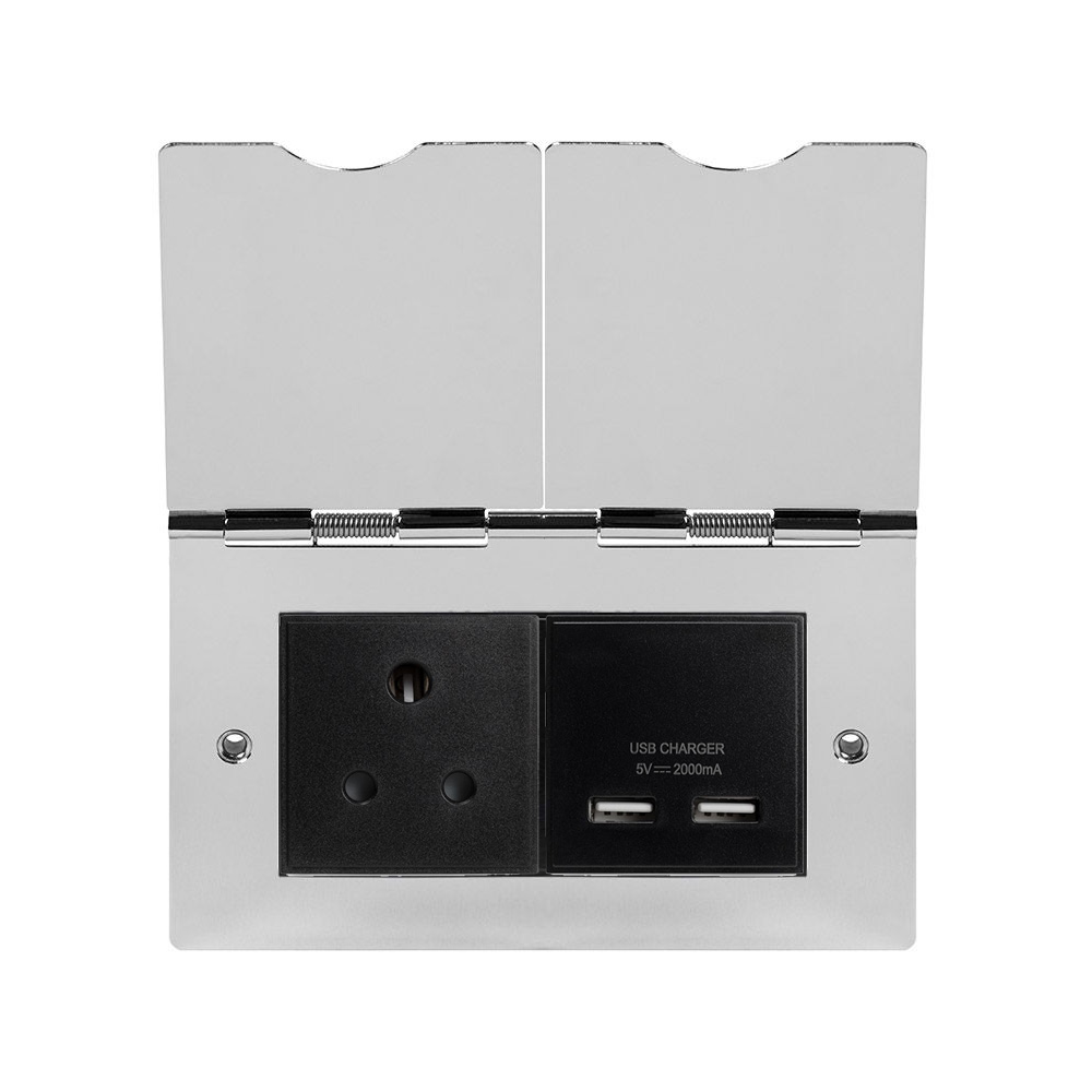 Soho Lighting Polished Chrome Screwless Double Floor Outlet 5Amp Socket & USB Charger - Blk Ins - Size: H 86mm X W 86mm