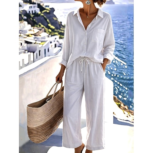 Set di pantaloni in cotone e lino da donna Bolero Top Camicia a maniche lunghe Colletto Colore solido Moda Streetwear Casuale Quotidiano Outdoor Blu Nero Bianco Estate Vestibilità ampia