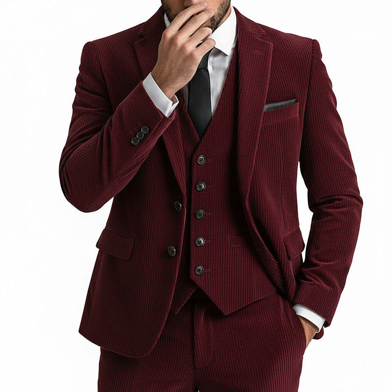 Men's Casual Business Corduroy Suit Notch Lapel White Burgundy Fashion Daily Striped Tailored Fit 3 Piece Single Breasted Two-buttons