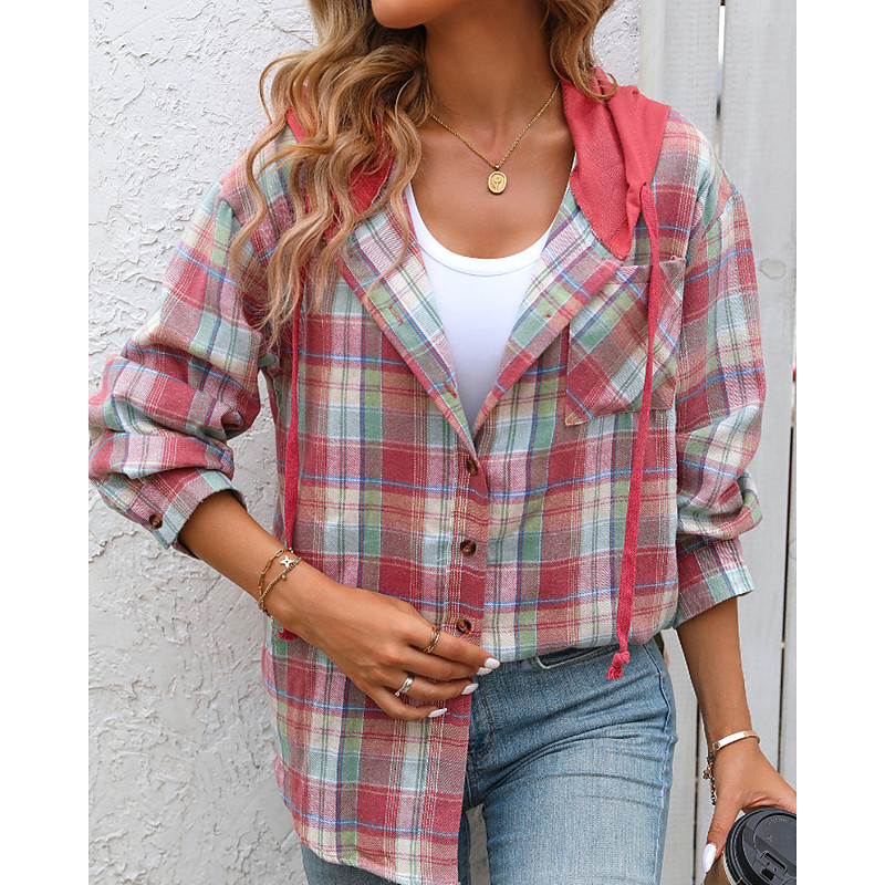 Women's Blouse Plaid Casual Long Sleeve Hooded Regular Tops Daily Going out Patchwork Buttons Blue Black Red Purple Green Fall Winter
