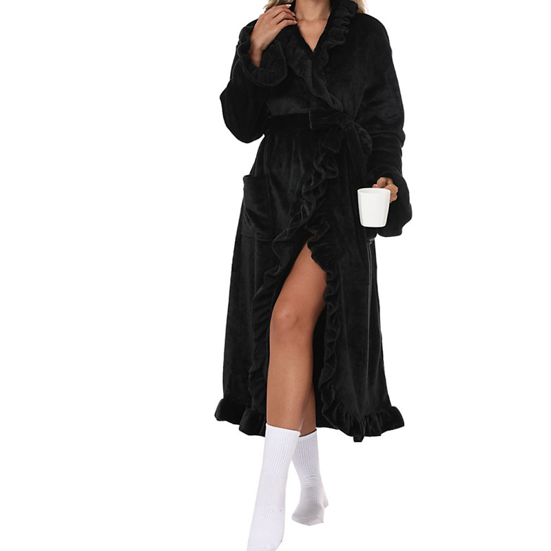 Women's Pajamas Robe Flannel Warm Fashion Pure Color Ruffle Pocket Home Daily Bed Long Sleeve Crew Neck Black White Pink Red Purple Fall Winter Regular Fit