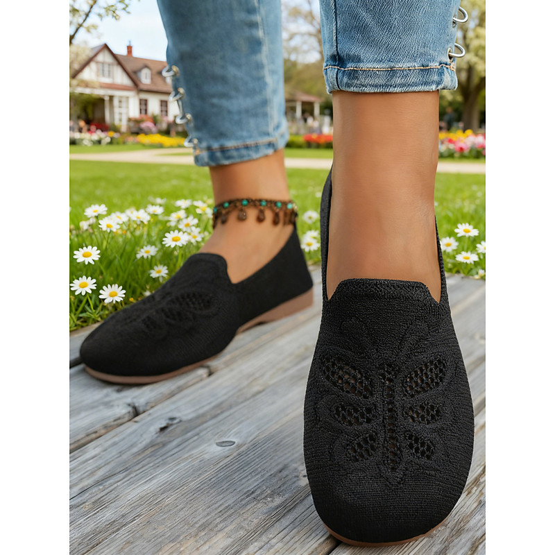 Women's Light Brown Knitted Slip-On Shoes with Butterfly Pattern – Breathable Flat Shoes for Summer Walking, Driving Casual Comfort