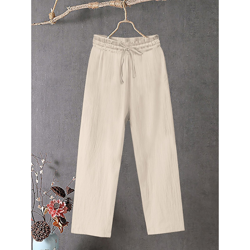 Women's Cotton Linen Wide Leg Solid Color Chinos Baggy Pants Basic Casual Full Length High Waist Plain Drawstring Comfort Outdoor Micro-elastic Vacation Street Daily Black White Blue Khaki