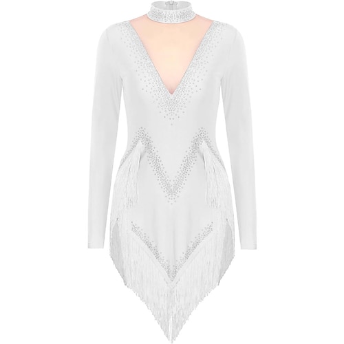 Abito da ballo latino con frange, nappe, cristalli/strass, allenamento da donna, senza maniche, chinlon alto