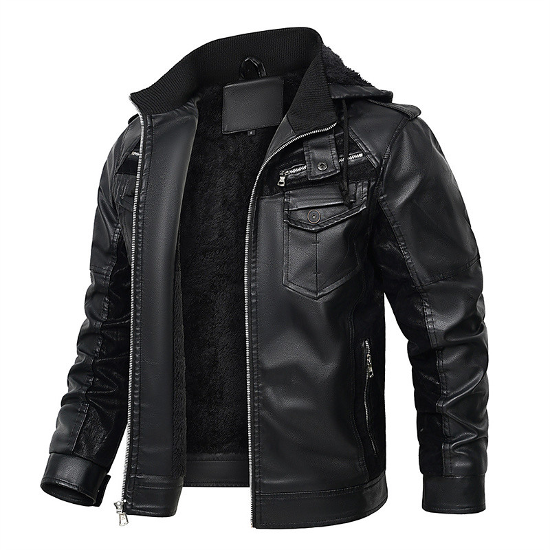 Men's Faux Leather Jacket Fleece Jacket Biker Jacket Motorcycle Jacket Vacation Daily Windproof Warm Pocket Winter Plain Fashion Classic Hooded Regular Black Jacket