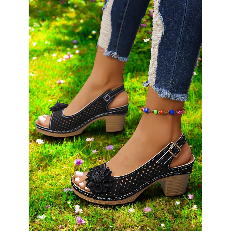 Women's Floral Cutout Slingback Sandals – Comfortable Chunky Heel Summer Sandals for Casual Garden Party Wear