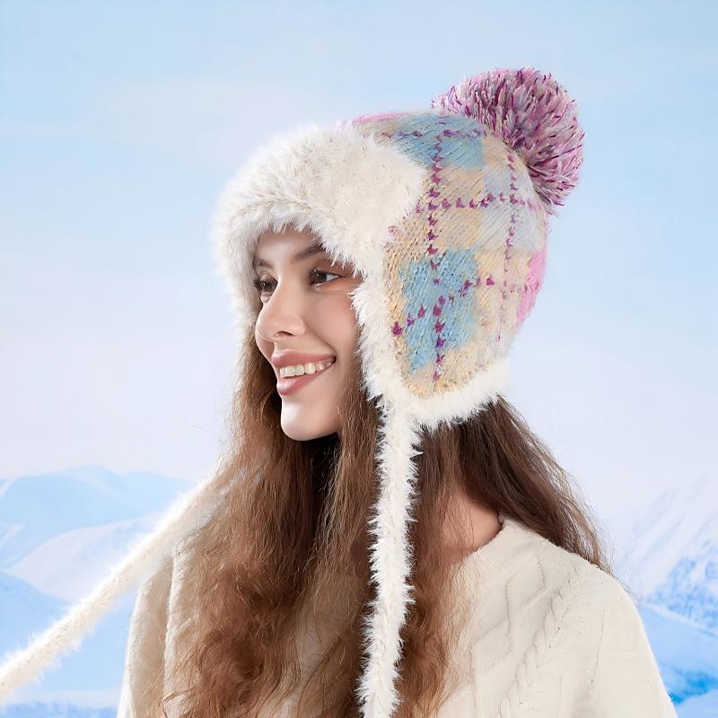 Winter Outdoor Knit Beanie for Women Fair Isle Style Warm Hat Ear Flap Plush Lined Ski Cap Cold Weather Protection Cute Face Slimming Winter Headwear
