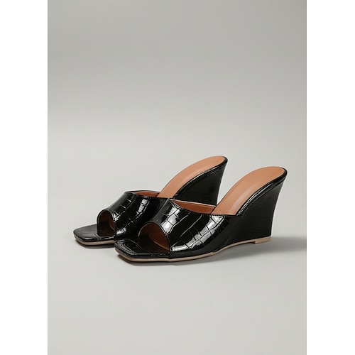 sandali da donna con tacco quadrato e punta aperta, con stampa coccodrillo nera, per uscite estive casual e look eleganti da ufficio