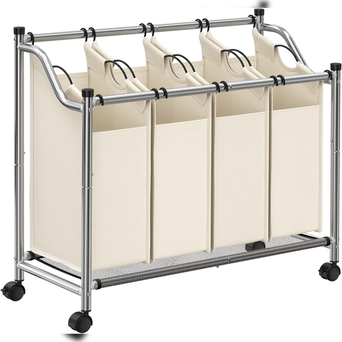 Wäschewagen 140L, Wäschesammler 4 x 35 Liter, aus 600D Oxford-Gewebe, Stahlrahmen, mit 4 abnehmbaren Stofftaschen, bis 40kg belastbar, beige