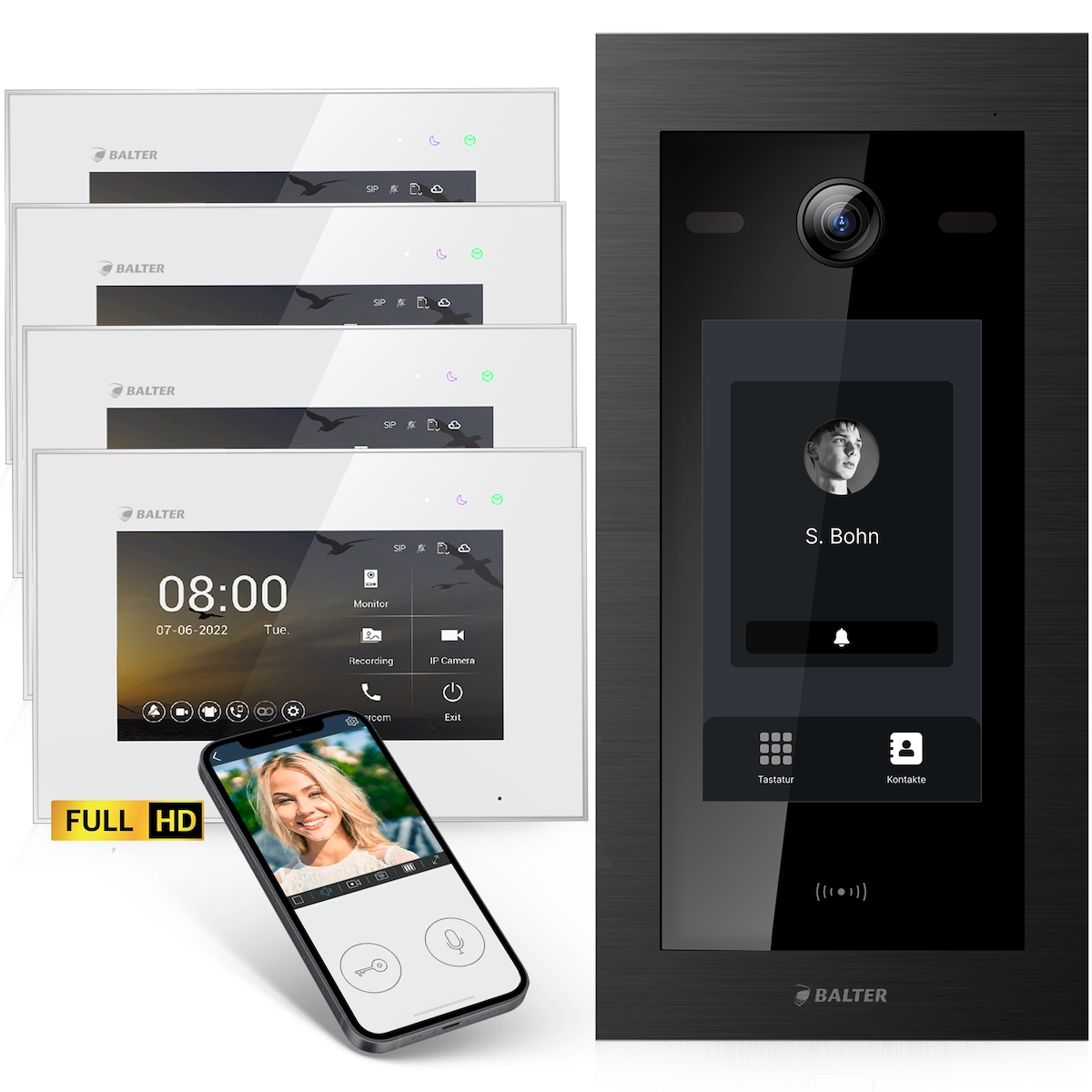HD Video Türsprechanlage mit Touchscreen und RFID für 4 Familienhaus, 4x Monitore, Balter EVO HD Touch Schwarz