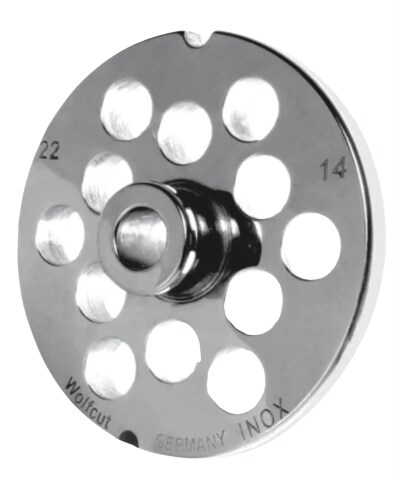 WOLFCUT - Fleischwolfscheibe mit Nabe und 2 Nuten mit 14,0 mm Bohrung kompatibel mit allen gängigen Fleischwolf Marken Größe 22