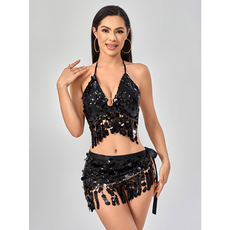 Carnival 2026Rio Carnival Samba Dancewear Women's Dazzling Multi-Color Sequin Fringe 2 Piece Set - Halter Crop Top Skirt Outfit Rave Parties Brazil Festival Performance Costume