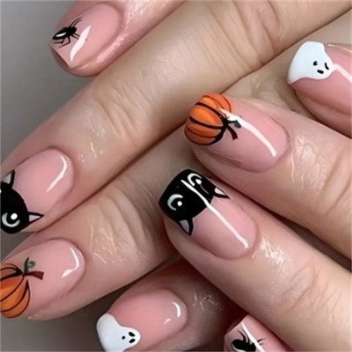 Unghie finte corte quadrate con fiori gialli di Halloween, unghie finte quadrate corte con graziosi disegni di fantasmini, unghie artificiali opache nere, unghie adesive a copertura totale, unghie