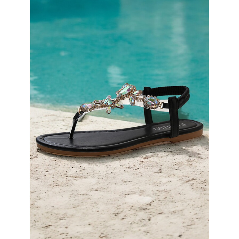 Women's Green Rhinestone Embellished T-Strap Sandals with Elastic Ankle Strap – Elegant Summer Footwear for Beach, Parties, or Casual Wear