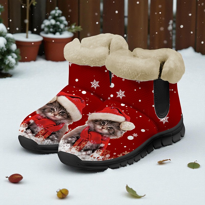 Women's Christmas Warm Fur-Lined Boots with Cute Santa Cat Print – Cozy Winter Style, Non-Slip Lightweight Sole, Perfect for Holiday Parties, Outdoor Walks, Casual Wear and Christmas Gift Giving