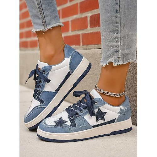 sneakers da donna in tela denim blu con toppa a stella – scarpe basse stringate effetto consumato per abbigliamento casual da strada, scuola e passeggiate